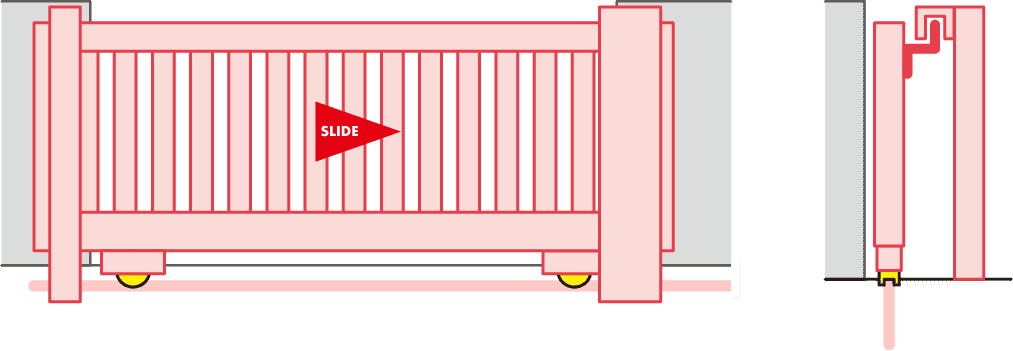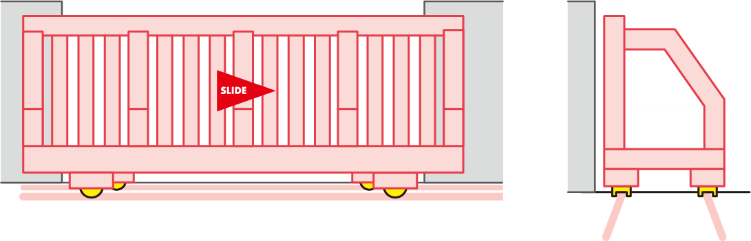 門扉後部に控えがあり、自立してスライド開閉する門扉。高重量・強風圧に対応でき、背を高くすることやパネル張りが可能なため意匠デザインに自由があり、大開口、耐衝撃、防音や目隠しにも対応可能。